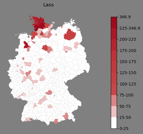 Relative Verteilung des Namens Lass (1996)Direkt zur Karte Die Farbskala zeigt die Anzahl von "Lass" bezogen auf je 1 Million Einträge. |
