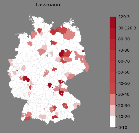 Relative Verteilung des Namens Lassmann (1996)Direkt zur Karte Die Farbskala zeigt die Anzahl von "Lassmann" bezogen auf je 1 Million Einträge. |