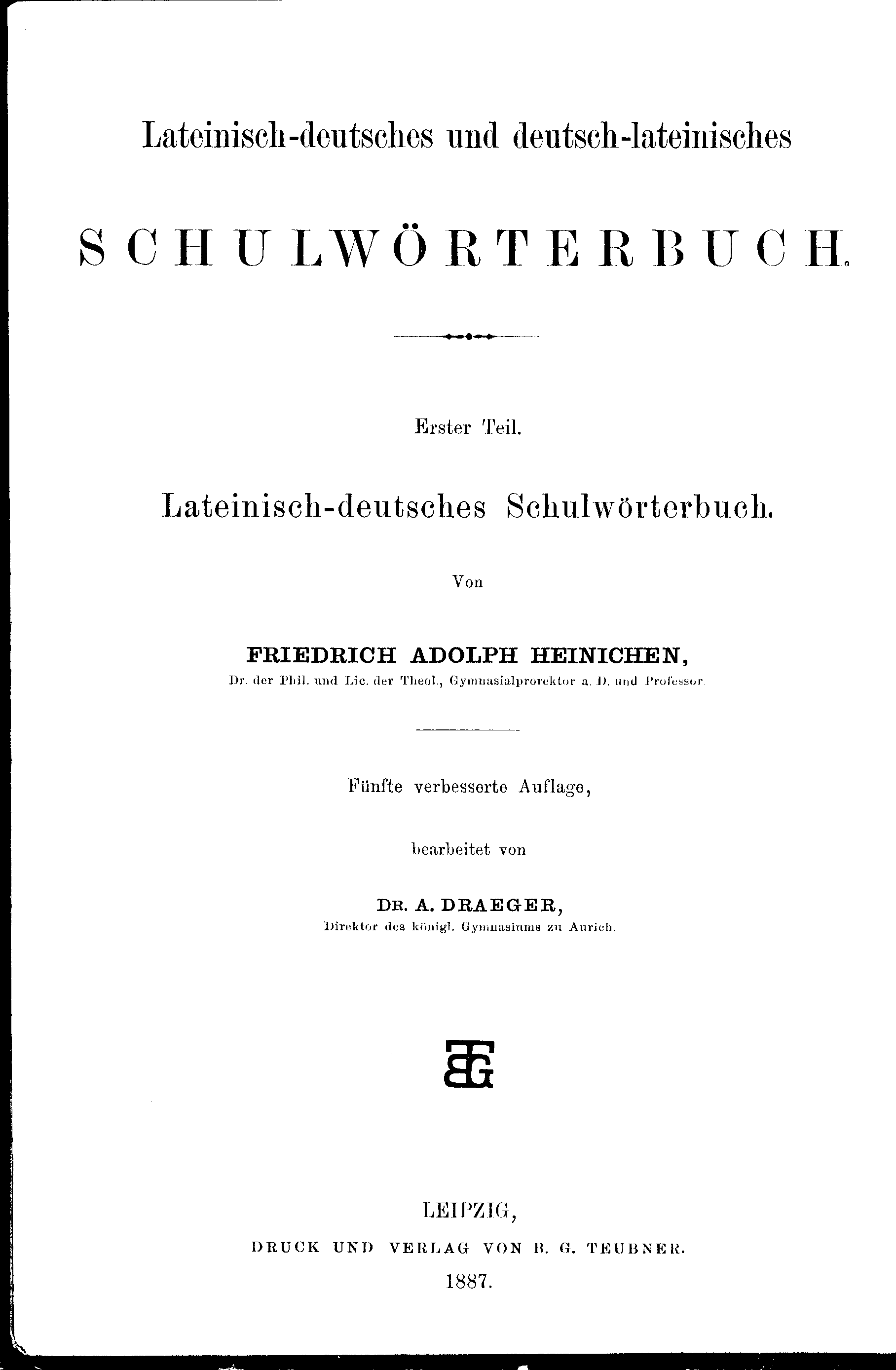 - Friedrich Adoph Heinichen: Lateinisch-deutsches Schulwörterbuch zu den Prosaikern Cicero, Caesar, Sallust, Nepos, Livius, Curtius, Plinius d. J. (Briefe), Quintilian (10. Buch), Tacitus, Sueton, Justin, Aurelius Victor Eutrop und zu den Dichtern Plantus, Terenz, Catull, Vergil, Horaz, Tibull, Properz, Ovid und Phaedrus, Leipzig: B. G. Teubner 1887.