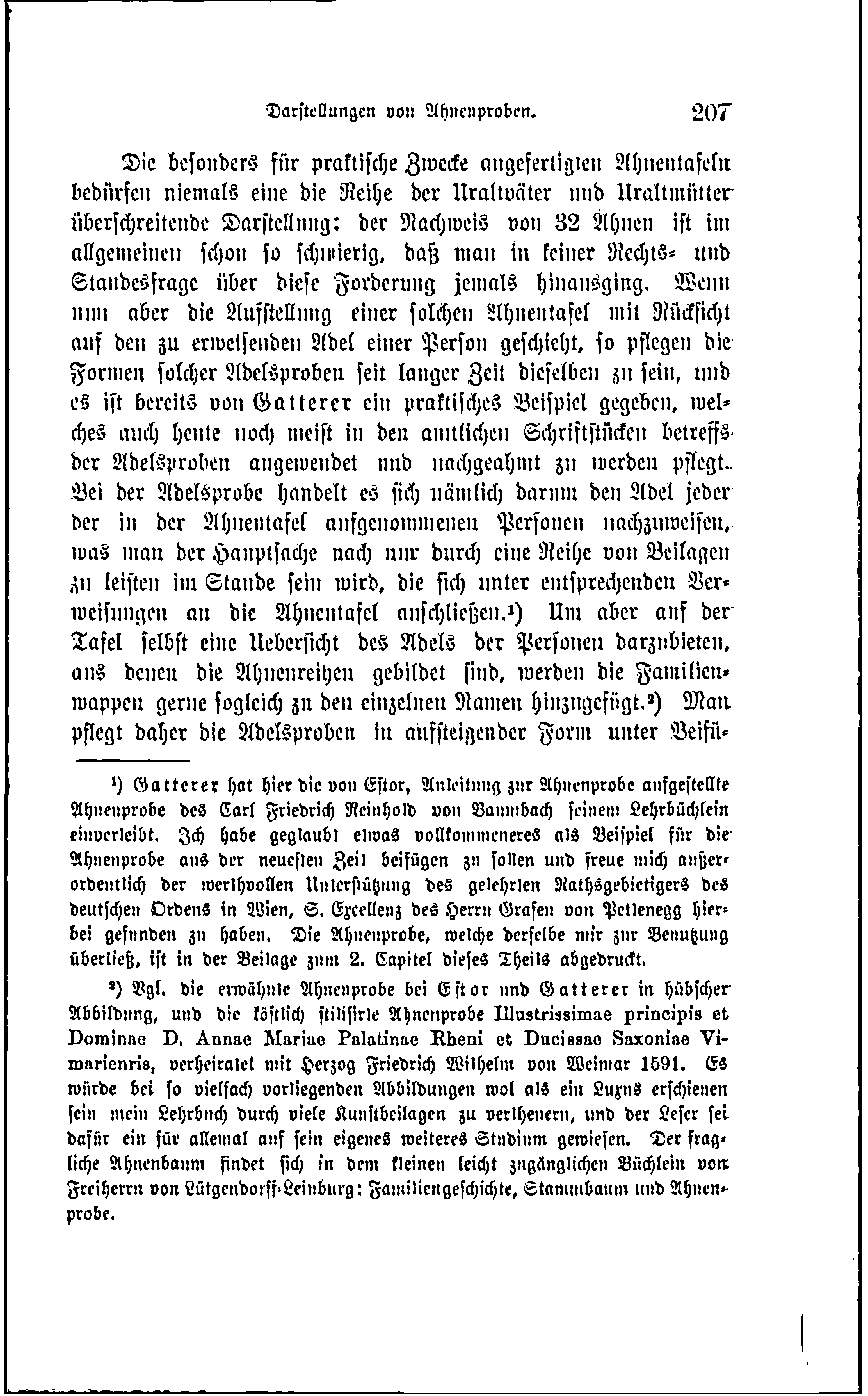 - ↑ Vgl. die erwähnte Ahnenprobe bei Estor und Gatterer in hübscher Abbildung, und die köstlich stilisirte Ahnenprobe Illustrissimae principis et Dominae D. Annae Mariae Palatinae Rheni et Ducissae Saxoniae Vimarienris, verheiratet mit Herzog Friedrich Wilhelm von Weimar 1591. Es würde bei so vielfach vorliegenden Abbildungen wol als ein Luxus erschienen sein mein Lehrbuch durch viele Kunstbeilagen zu vertheuern, und der Leser sei dafür ein für allemal auf sein eigenes weiteres Studium gewiesen. Der fragliche Ahnenbaum findet sich in dem kleinen leicht zugänglichen Büchlein von Freiherrn von Lütgendorff-Leinburg: Familiengeschichte, Stammbaum und Ahnenprobe.