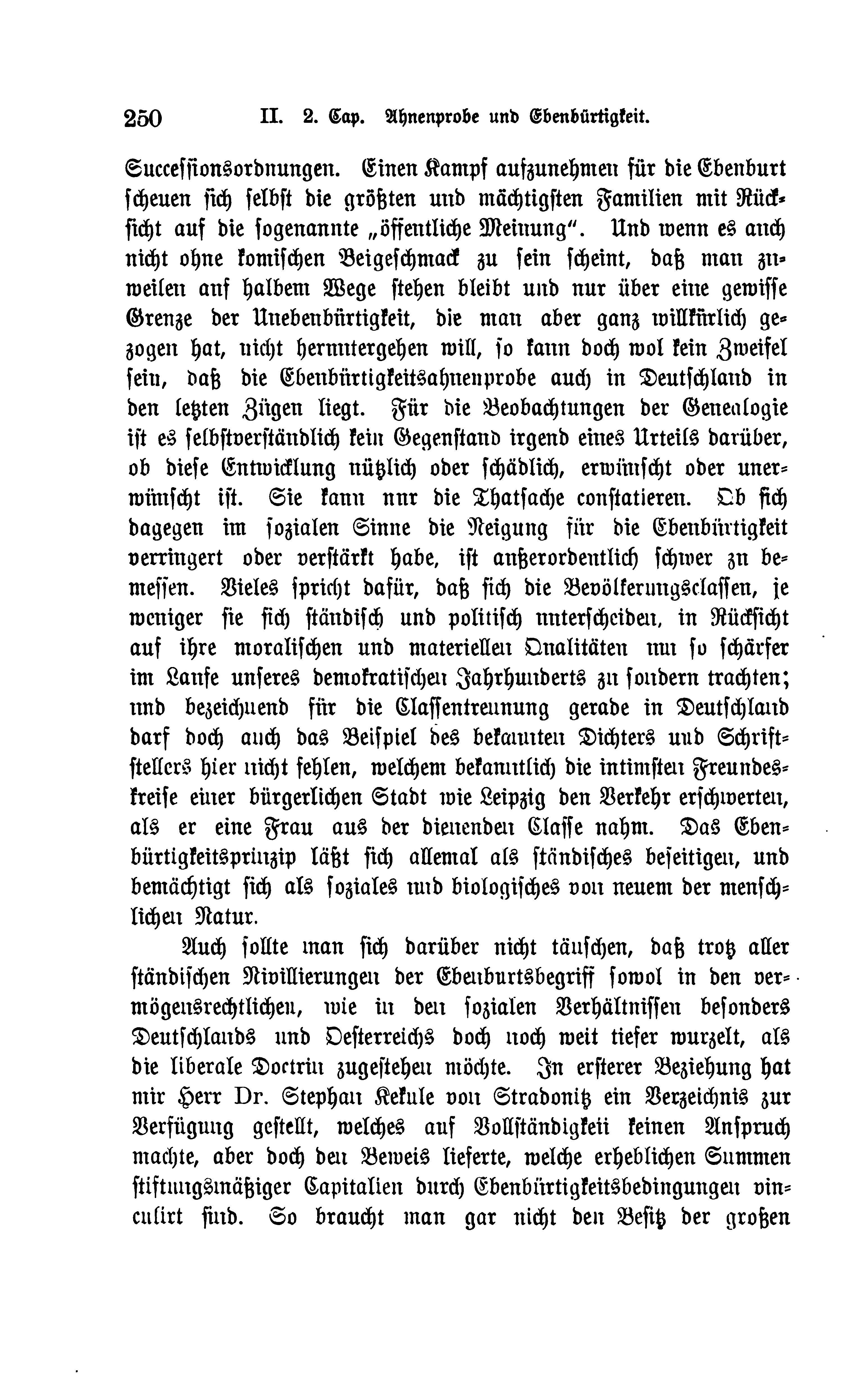 Auch sollte man sich darüber nicht täuschen, daß trotz aller ständischen Nivillierungen der Ebenburtsbegriff sowol in den vermögensrechtlichen, wie in den sozialen Verhältnissen besonders Deutschlands und Oesterreichs doch noch weit tiefer wurzelt. als die liberale Doctrin zugestehen möchte. In ersterer Beziehung hat mir Herr Dr. Stephan Kekule von Stradonitz ein Verzeichnis zur Verfügung gestellt, welches auf Vollständigkeit keinen Anspruch machte, aber doch den Beweis lieferte, welche erheblichen Summen stiftungsmäßiger Kapitalien durch Ebenbürtigkeitsbedingungen vinculirt sind. So braucht man gar nicht den Besitz der großen