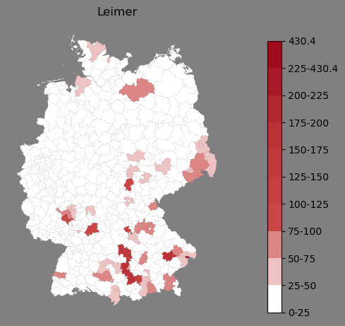 Relative Verteilung des Namens Leimer (1996)Direkt zur Karte Die Farbskala zeigt die Anzahl von "Leimer" bezogen auf je 1 Million Einträge. |