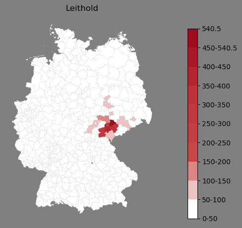 Relative Verteilung des Namens Leithold (1996)Direkt zur Karte Die Farbskala zeigt die Anzahl von "Leithold" bezogen auf je 1 Million Einträge. |