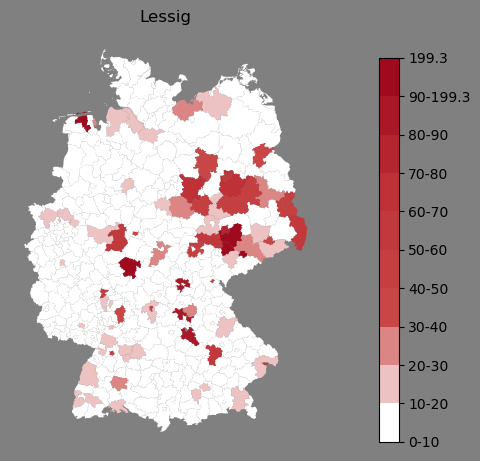 Relative Verteilung des Namens Lessig (1996)Direkt zur Karte Die Farbskala zeigt die Anzahl von "Lessig" bezogen auf je 1 Million Einträge. |