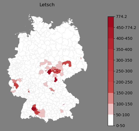 Relative Verteilung des Namens Letsch (1996)Direkt zur Karte Die Farbskala zeigt die Anzahl von "Letsch" bezogen auf je 1 Million Einträge. |