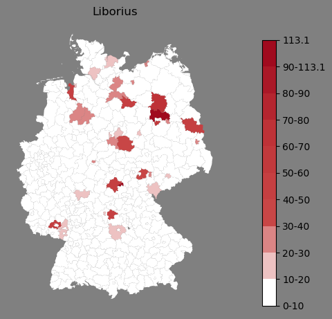 Relative Verteilung des Namens Liborius (1996)Direkt zur Karte Die Farbskala zeigt die Anzahl von "Liborius" bezogen auf je 1 Million Einträge. |