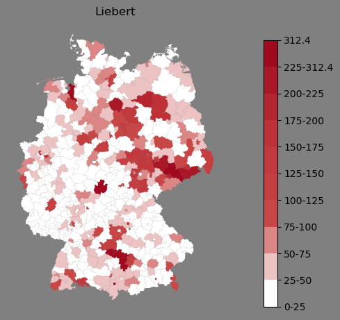Relative Verteilung des Namens Liebert (1996)Direkt zur Karte Die Farbskala zeigt die Anzahl von "Liebert" bezogen auf je 1 Million Einträge. |