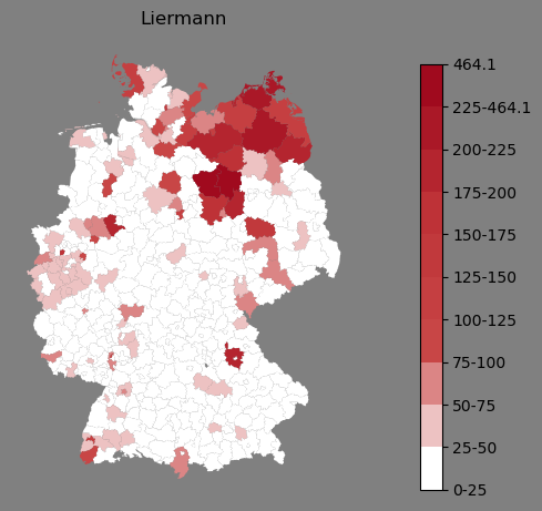 Absolute Verteilung des Namens Liermann (1890)Direkt zur Karte Absolute Verteilung des Namens "Liermann" um 1890 im damaligen Deutschen Reich Sie können die Karte innerhalb des Fensters zoomen und verschieben. |