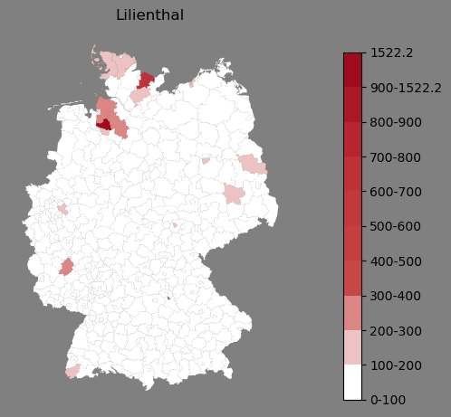 Absolute Verteilung des Namens Lilienthal (1890)Direkt zur Karte Absolute Verteilung des Namens "Lilienthal" um 1890 im damaligen Deutschen Reich Sie können die Karte innerhalb des Fensters zoomen und verschieben. |