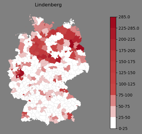 Absolute Verteilung des Namens Lindenberg (1890)Direkt zur Karte Absolute Verteilung des Namens "Lindenberg" um 1890 im damaligen Deutschen Reich Sie können die Karte innerhalb des Fensters zoomen und verschieben. |