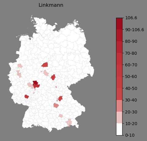 Relative Verteilung des Namens Linkmann (1996)Direkt zur Karte Die Farbskala zeigt die Anzahl von "Linkmann" bezogen auf je 1 Million Einträge. |