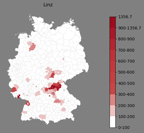 Absolute Verteilung des Namens Linz (1890)Direkt zur Karte Absolute Verteilung des Namens "Linz" um 1890 im damaligen Deutschen Reich Sie können die Karte innerhalb des Fensters zoomen und verschieben. |