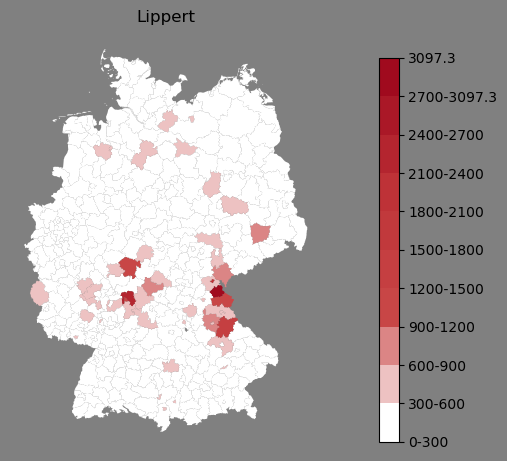 Relative Verteilung des Namens Lippert (1996)Direkt zur Karte Die Farbskala zeigt die Anzahl von "Lippert" bezogen auf je 1 Million Einträge. |