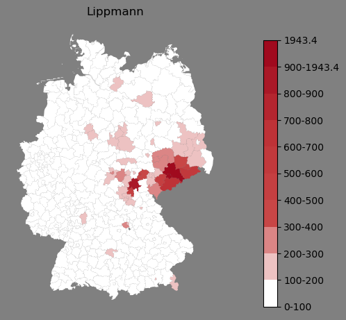 Absolute Verteilung des Namens Lippmann (1890)Direkt zur Karte Absolute Verteilung des Namens "Lippmann" um 1890 im damaligen Deutschen Reich Sie können die Karte innerhalb des Fensters zoomen und verschieben. |