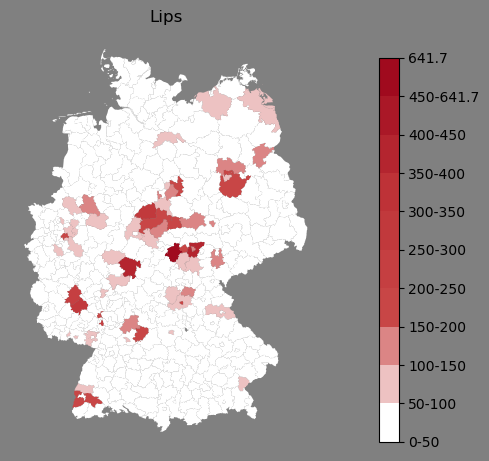 Relative Verteilung des Namens Lips (1996)Direkt zur Karte Die Farbskala zeigt die Anzahl von "Lips" bezogen auf je 1 Million Einträge. |