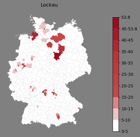 Relative Verteilung des Namens Lockau (1996)Direkt zur Karte Die Farbskala zeigt die Anzahl von "Lockau" bezogen auf je 1 Million Einträge. |