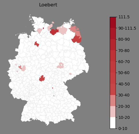 Relative Verteilung des Namens Loebert (1996)Direkt zur Karte Die Farbskala zeigt die Anzahl von "Loebert" bezogen auf je 1 Million Einträge. |