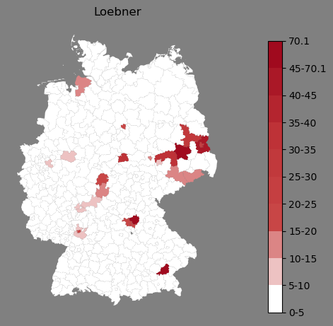 Absolute Verteilung des Namens Loebner (1890)Direkt zur Karte Absolute Verteilung des Namens "Loebner" um 1890 im damaligen Deutschen Reich Sie können die Karte innerhalb des Fensters zoomen und verschieben. |