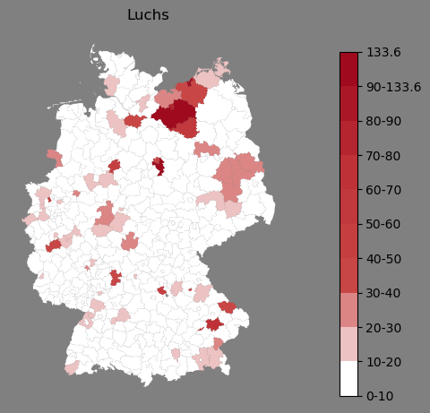 Absolute Verteilung des Namens Luchs (1890)Direkt zur Karte Absolute Verteilung des Namens "Luchs" um 1890 im damaligen Deutschen Reich Sie können die Karte innerhalb des Fensters zoomen und verschieben. |