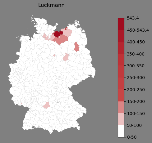 Relative Verteilung des Namens Luckmann (1996)Direkt zur Karte Die Farbskala zeigt die Anzahl von "Luckmann" bezogen auf je 1 Million Einträge. |