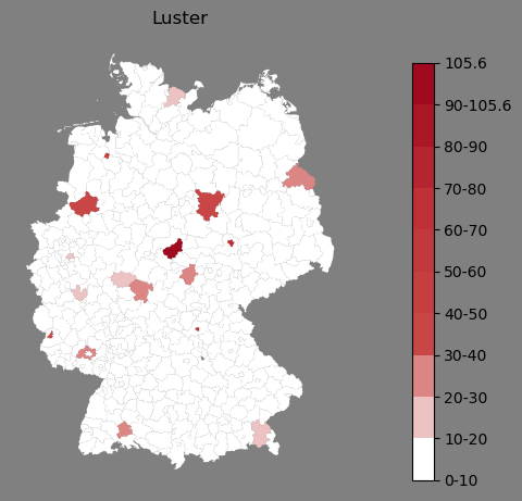 Relative Verteilung des Namens Luster (1996)Direkt zur Karte Die Farbskala zeigt die Anzahl von "Luster" bezogen auf je 1 Million Einträge. |