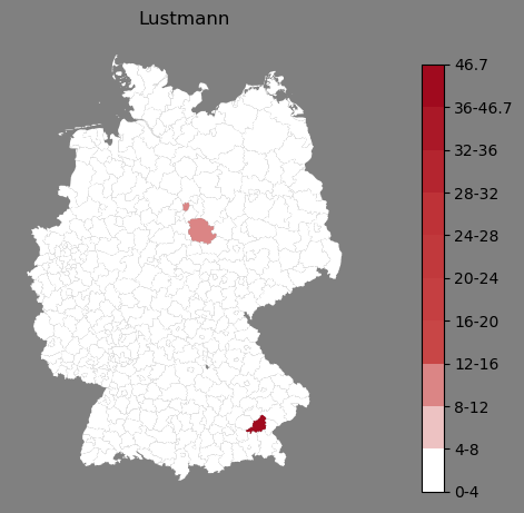 Relative Verteilung des Namens Lustmann (1996)Direkt zur Karte Die Farbskala zeigt die Anzahl von "Lustmann" bezogen auf je 1 Million Einträge. |