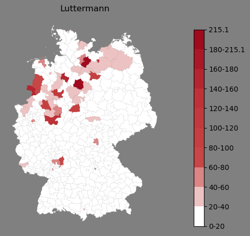 Relative Verteilung des Namens Luttermann (1996)Direkt zur Karte Die Farbskala zeigt die Anzahl von "Luttermann" bezogen auf je 1 Million Einträge. |