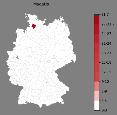 Relative Verteilung des Namens Macatis (1996)Direkt zur Karte Die Farbskala zeigt die Anzahl von "Macatis" bezogen auf je 1 Million Einträge. |