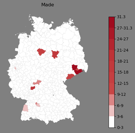 Relative Verteilung des Namens Made (1996)Direkt zur Karte Die Farbskala zeigt die Anzahl von "Made" bezogen auf je 1 Million Einträge. |