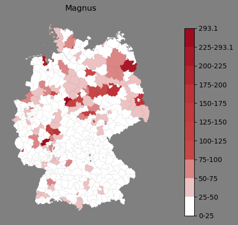 Relative Verteilung des Namens Magnus (1996)Direkt zur Karte Die Farbskala zeigt die Anzahl von "Magnus" bezogen auf je 1 Million Einträge. |
