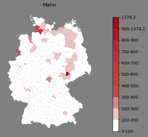 Relative Verteilung des Namens Mahn (1996)Direkt zur Karte Die Farbskala zeigt die Anzahl von "Mahn" bezogen auf je 1 Million Einträge. |
