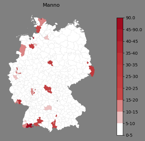 Relative Verteilung des Namens Manno (1996)Direkt zur Karte Die Farbskala zeigt die Anzahl von "Manno" bezogen auf je 1 Million Einträge. |