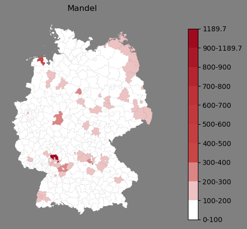 Relative Verteilung des Namens Mandel (1996)Direkt zur Karte Die Farbskala zeigt die Anzahl von "Mandel" bezogen auf je 1 Million Einträge. |