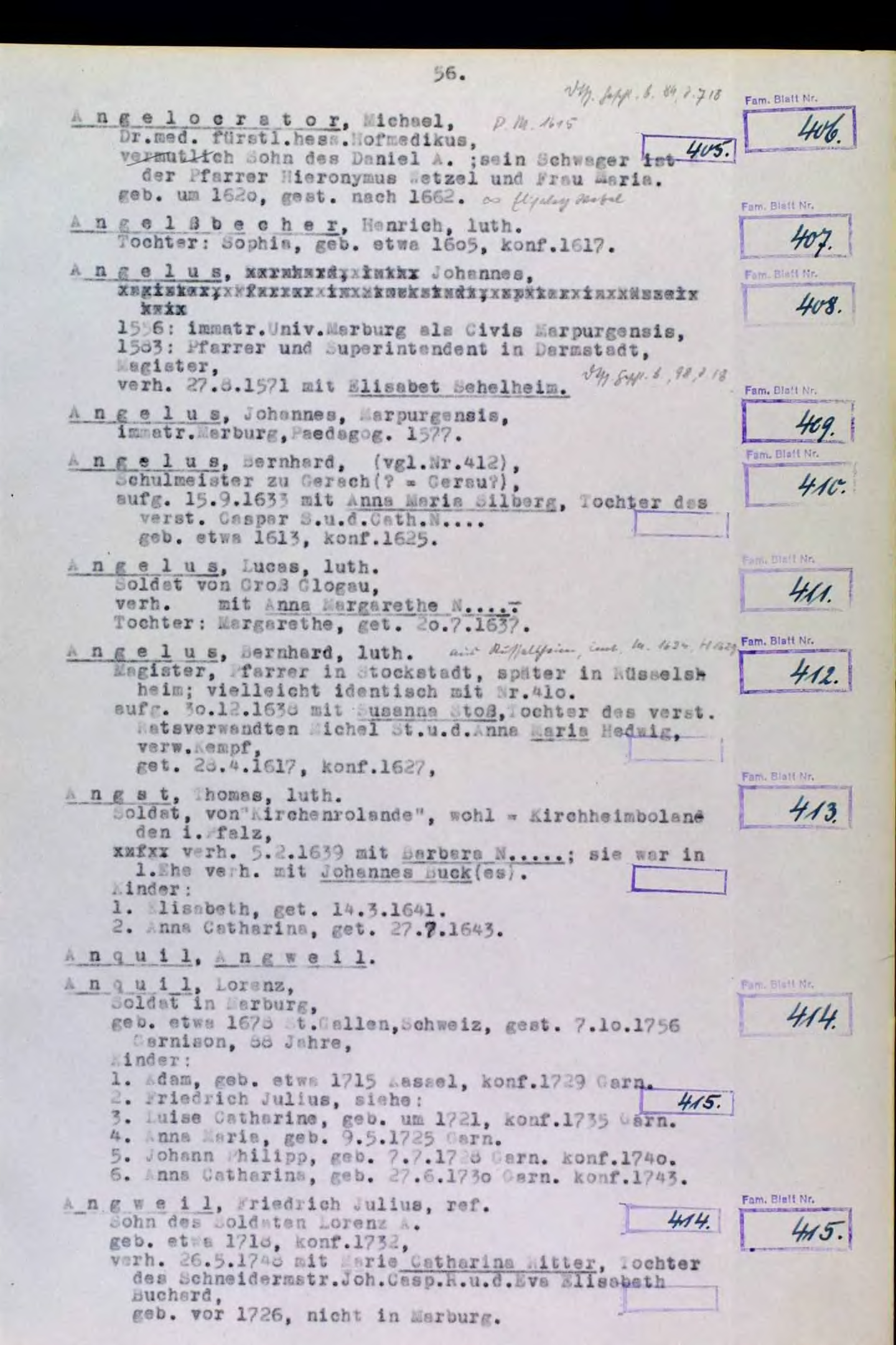 | Seit Fertigstellung des Marburger Sippenbuches 1950-1966 sind zahlreiche Ergänzungen und auch notwendige Korrekturen bekannt geworden. Bitte beachten Sie daher unbedingt die Ergänzungen und Korrekturen zu dieser Seite. Wenn Sie selbst Ergänzungen vornehmen möchten, wenden Sie sich bitte an Benutzer:Ernestus. |