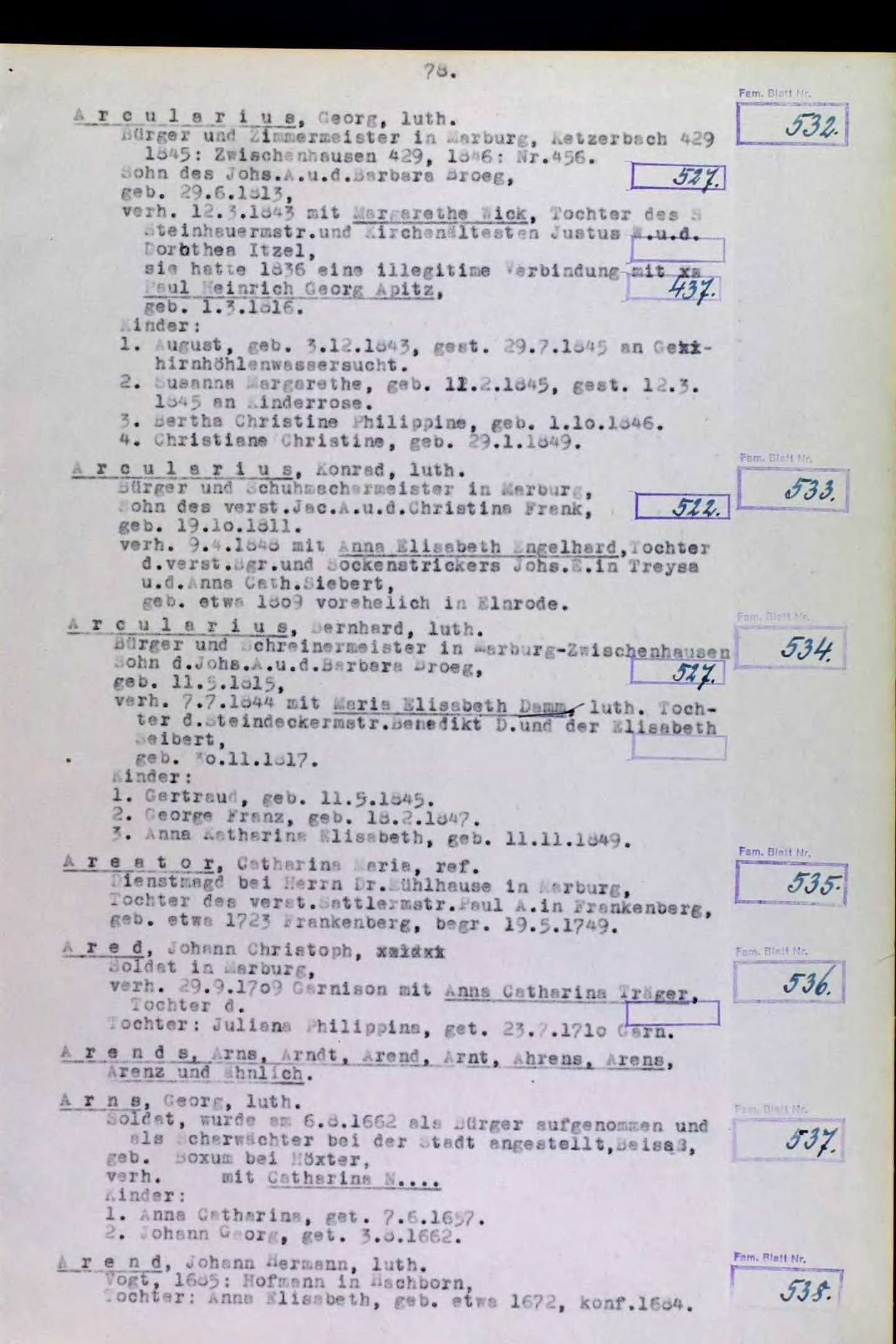 Info non-talk.svg Seit Fertigstellung des Marburger Sippenbuches 1950-1966 sind zahlreiche Ergänzungen und auch notwendige Korrekturen bekannt geworden. Zur aktuellen Seite existiert noch keine Ergänzunges- und Korrekturseite. Wenn Sie selbst Ergänzungen vornehmen möchten, wenden Sie sich bitte an Benutzer:Ernestus.
