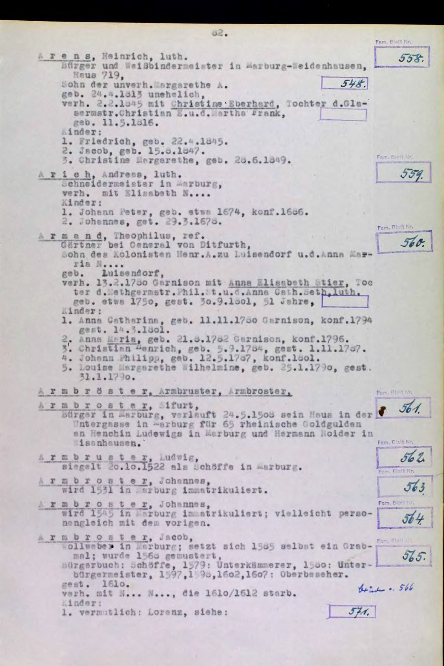 | Seit Fertigstellung des Marburger Sippenbuches 1950-1966 sind zahlreiche Ergänzungen und auch notwendige Korrekturen bekannt geworden. Bitte beachten Sie daher unbedingt die Ergänzungen und Korrekturen zu dieser Seite. Wenn Sie selbst Ergänzungen vornehmen möchten, wenden Sie sich bitte an Benutzer:Ernestus. |