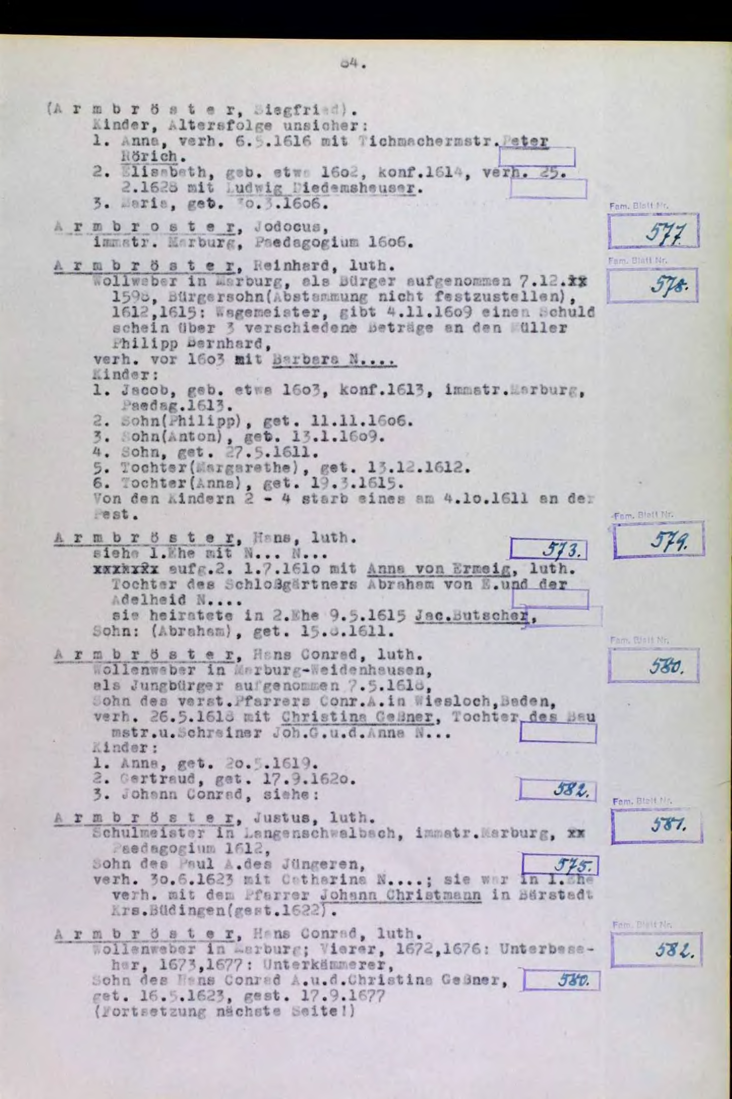| Seit Fertigstellung des Marburger Sippenbuches 1950-1966 sind zahlreiche Ergänzungen und auch notwendige Korrekturen bekannt geworden. Bitte beachten Sie daher unbedingt die Ergänzungen und Korrekturen zu dieser Seite. Wenn Sie selbst Ergänzungen vornehmen möchten, wenden Sie sich bitte an Benutzer:Ernestus. |