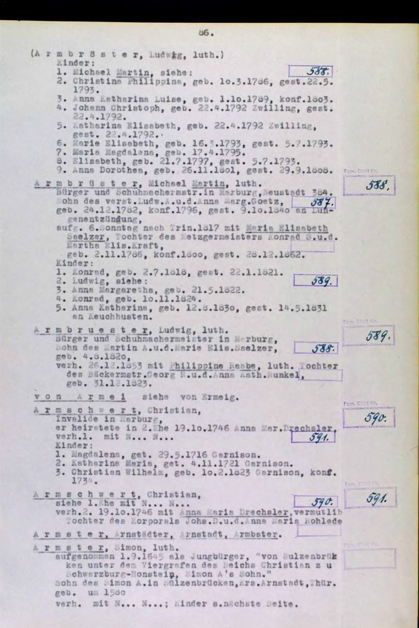 | Seit Fertigstellung des Marburger Sippenbuches 1950-1966 sind zahlreiche Ergänzungen und auch notwendige Korrekturen bekannt geworden. Zur aktuellen Seite existiert noch keine Ergänzunges- und Korrekturseite. Wenn Sie selbst Ergänzungen vornehmen möchten, wenden Sie sich bitte an Benutzer:Ernestus. |
