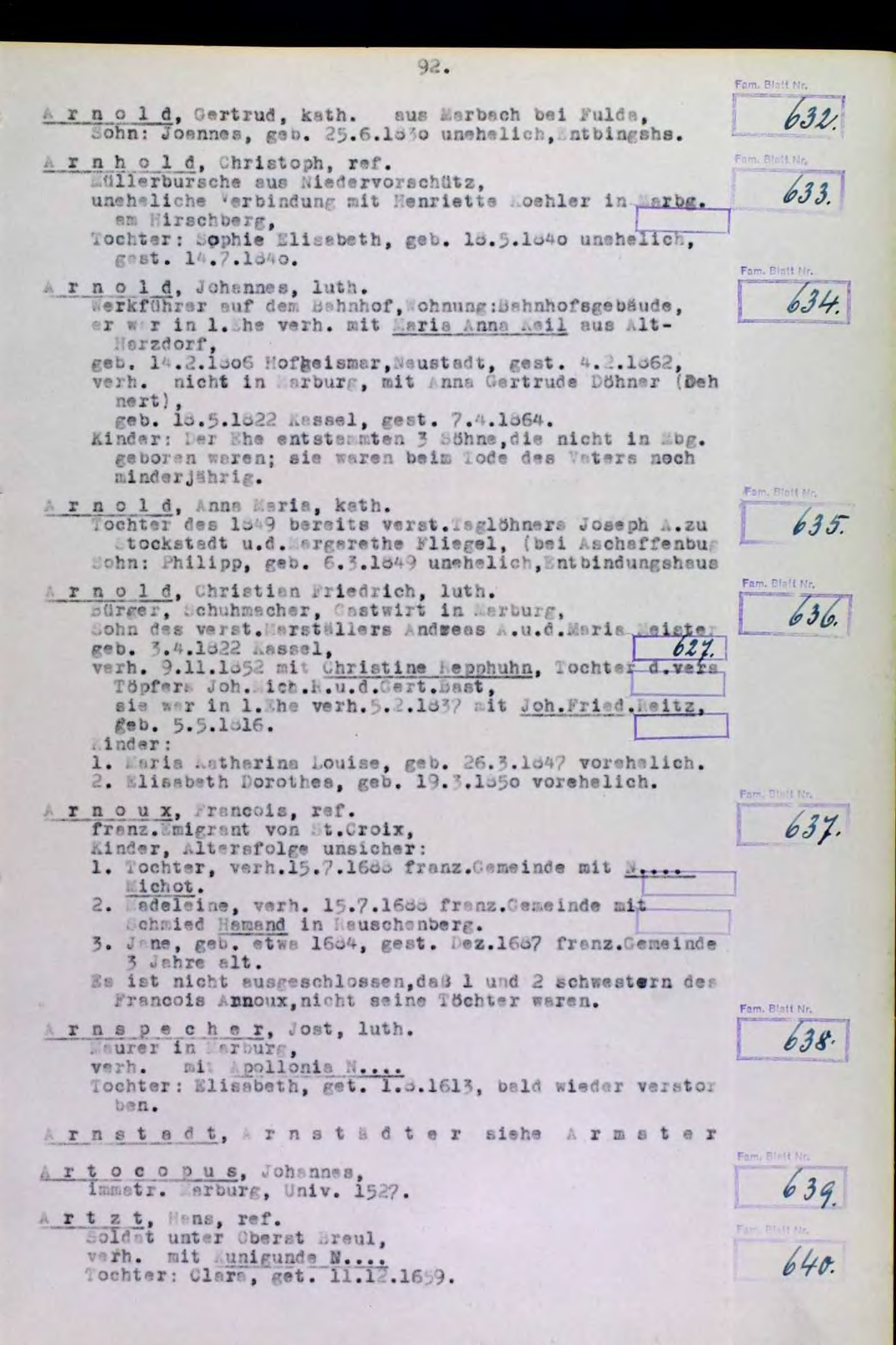 Info non-talk.svg Seit Fertigstellung des Marburger Sippenbuches 1950-1966 sind zahlreiche Ergänzungen und auch notwendige Korrekturen bekannt geworden. Bitte beachten Sie daher unbedingt die Ergänzungen und Korrekturen zu dieser Seite. Wenn Sie selbst Ergänzungen vornehmen möchten, wenden Sie sich bitte an Benutzer:Ernestus.
