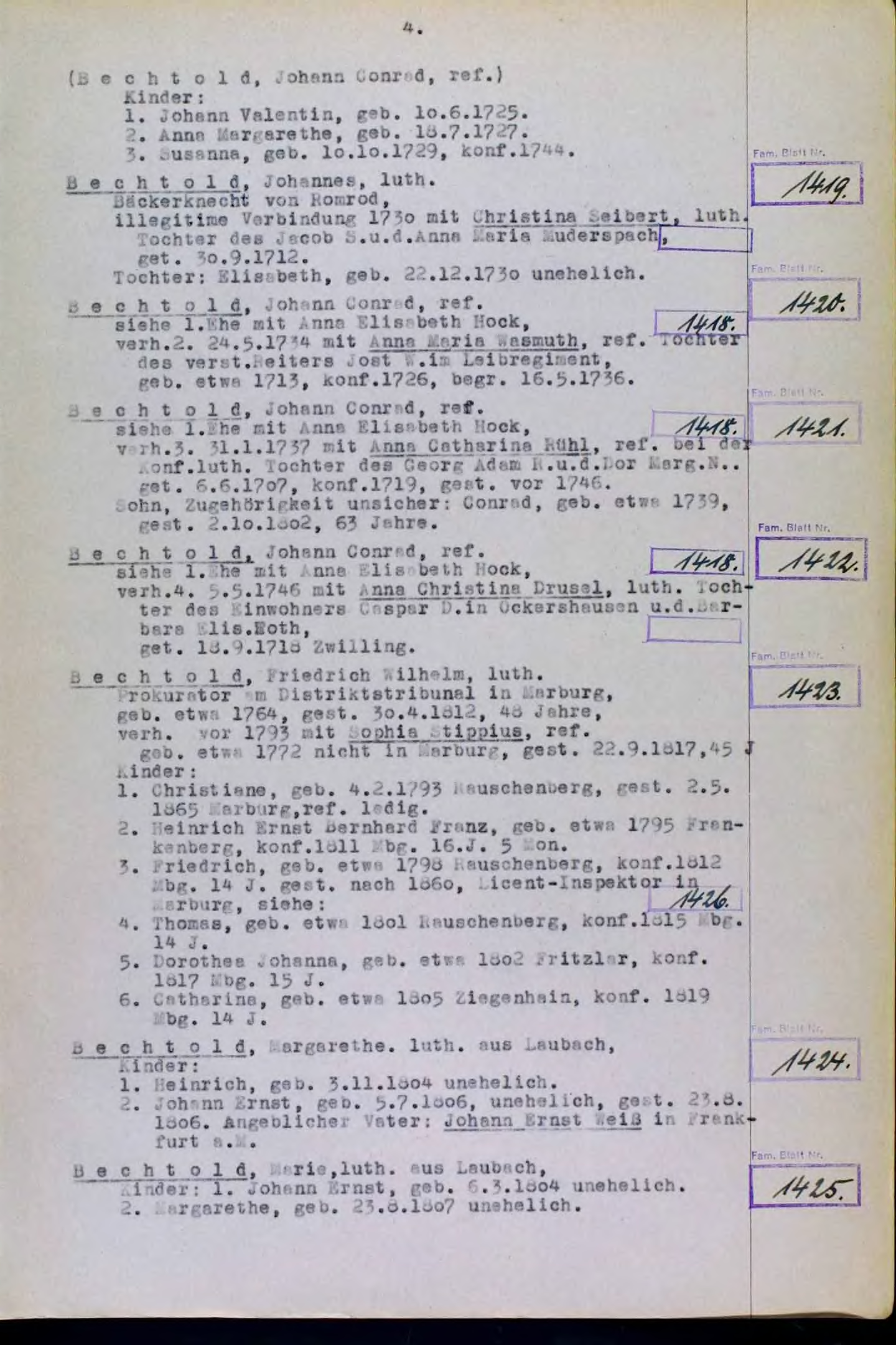 | Seit Fertigstellung des Marburger Sippenbuches 1950-1966 sind zahlreiche Ergänzungen und auch notwendige Korrekturen bekannt geworden. Zur aktuellen Seite existiert noch keine Ergänzunges- und Korrekturseite. Wenn Sie selbst Ergänzungen vornehmen möchten, wenden Sie sich bitte an Benutzer:Ernestus. |