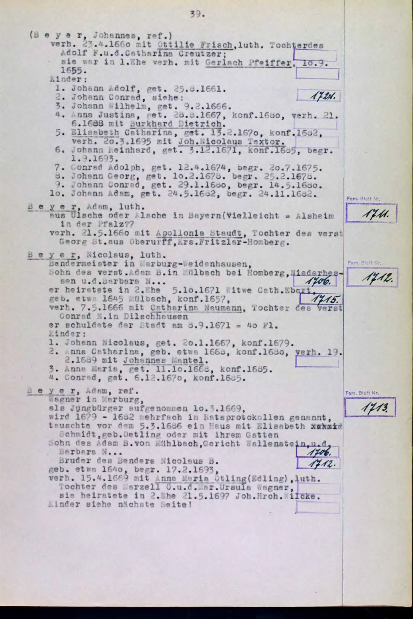 | Seit Fertigstellung des Marburger Sippenbuches 1950-1966 sind zahlreiche Ergänzungen und auch notwendige Korrekturen bekannt geworden. Zur aktuellen Seite existiert noch keine Ergänzunges- und Korrekturseite. Wenn Sie selbst Ergänzungen vornehmen möchten, wenden Sie sich bitte an Benutzer:Ernestus. |