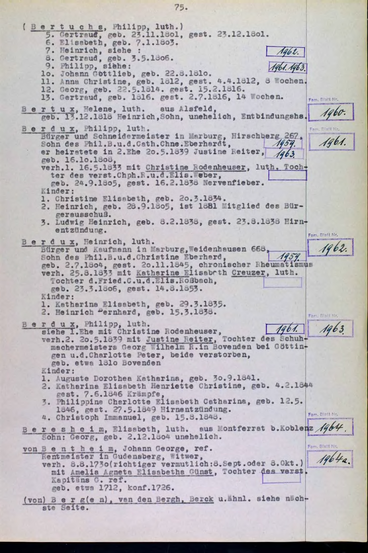| Seit Fertigstellung des Marburger Sippenbuches 1950-1966 sind zahlreiche Ergänzungen und auch notwendige Korrekturen bekannt geworden. Zur aktuellen Seite existiert noch keine Ergänzunges- und Korrekturseite. Wenn Sie selbst Ergänzungen vornehmen möchten, wenden Sie sich bitte an Benutzer:Ernestus. |