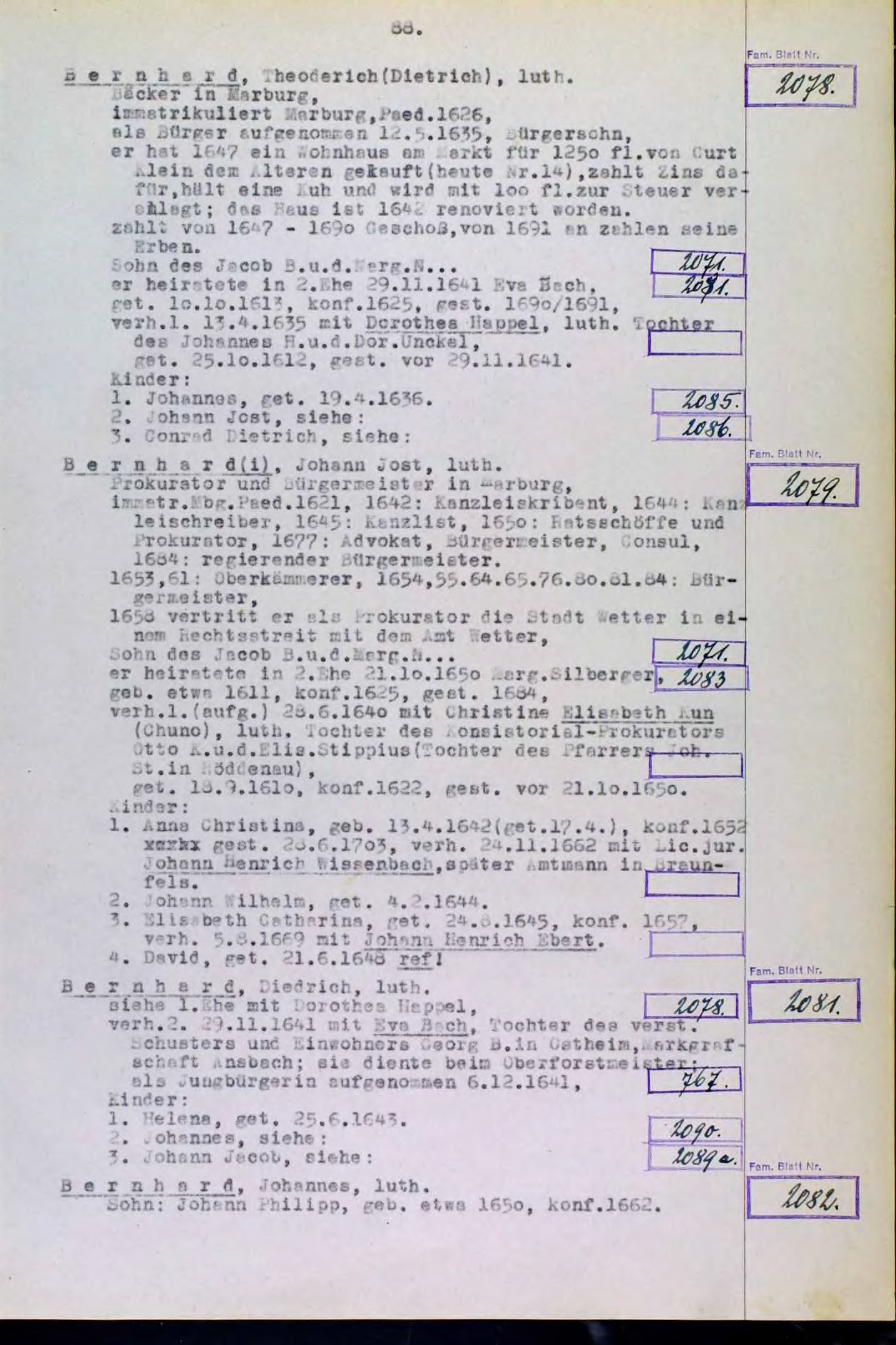 | Seit Fertigstellung des Marburger Sippenbuches 1950-1966 sind zahlreiche Ergänzungen und auch notwendige Korrekturen bekannt geworden. Zur aktuellen Seite existiert noch keine Ergänzunges- und Korrekturseite. Wenn Sie selbst Ergänzungen vornehmen möchten, wenden Sie sich bitte an Benutzer:Ernestus. |