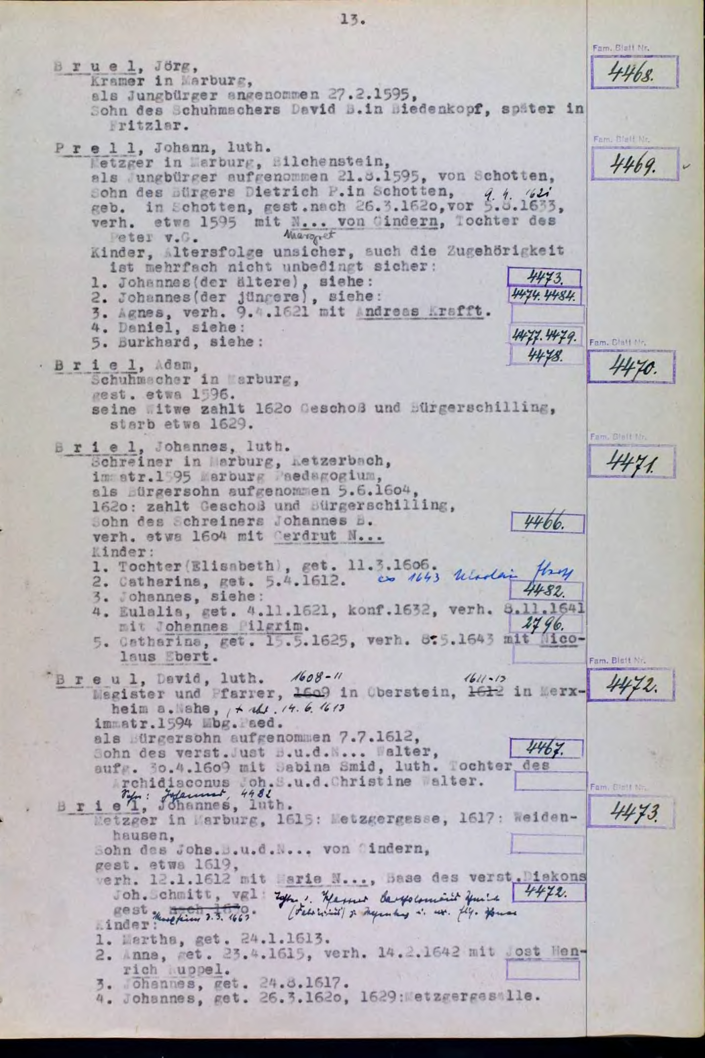| Seit Fertigstellung des Marburger Sippenbuches 1950-1966 sind zahlreiche Ergänzungen und auch notwendige Korrekturen bekannt geworden. Zur aktuellen Seite existiert noch keine Ergänzunges- und Korrekturseite. Wenn Sie selbst Ergänzungen vornehmen möchten, wenden Sie sich bitte an Benutzer:Ernestus. |