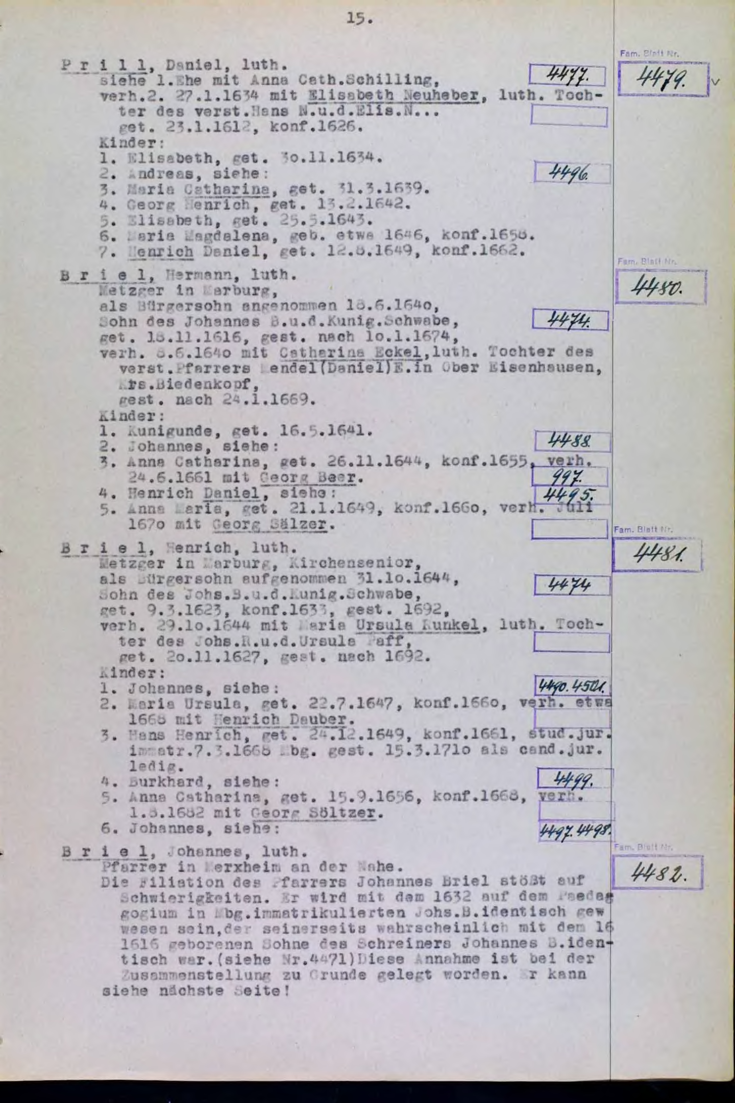 Info non-talk.svg Seit Fertigstellung des Marburger Sippenbuches 1950-1966 sind zahlreiche Ergänzungen und auch notwendige Korrekturen bekannt geworden. Zur aktuellen Seite existiert noch keine Ergänzunges- und Korrekturseite. Wenn Sie selbst Ergänzungen vornehmen möchten, wenden Sie sich bitte an Benutzer:Ernestus.