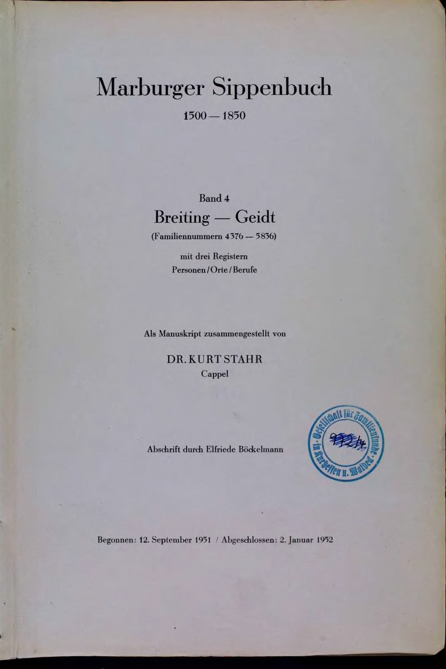 Das Marburger Sippenbuch wird in der Digitalen Bibliothek des Vereins für Computergenealogie e.V. veröffentlicht durch die Gesellschaft für Familienkunde in Kurhessen und Waldeck e.V. (GFKW) mit freundlicher Zustimmung der Erben von Dr. Kurt Stahr. Der Ergänzungsband 1 (Band 24) wird hier veröffentlicht mit freundlicher Zustimmung des Bearbeiters Werner Guth.