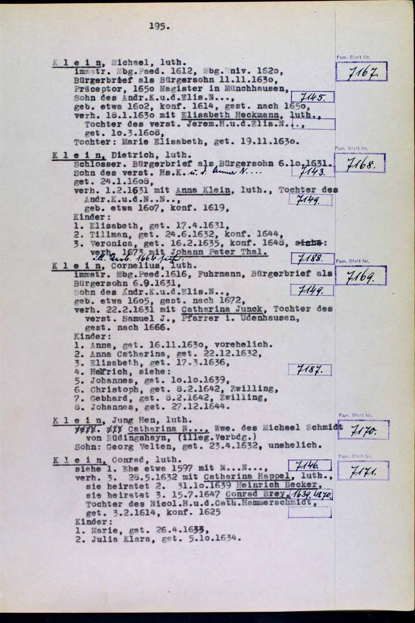 Info non-talk.svg Seit Fertigstellung des Marburger Sippenbuches 1950-1966 sind zahlreiche Ergänzungen und auch notwendige Korrekturen bekannt geworden. Zur aktuellen Seite existiert noch keine Ergänzunges- und Korrekturseite. Wenn Sie selbst Ergänzungen vornehmen möchten, wenden Sie sich bitte an Benutzer:Ernestus.