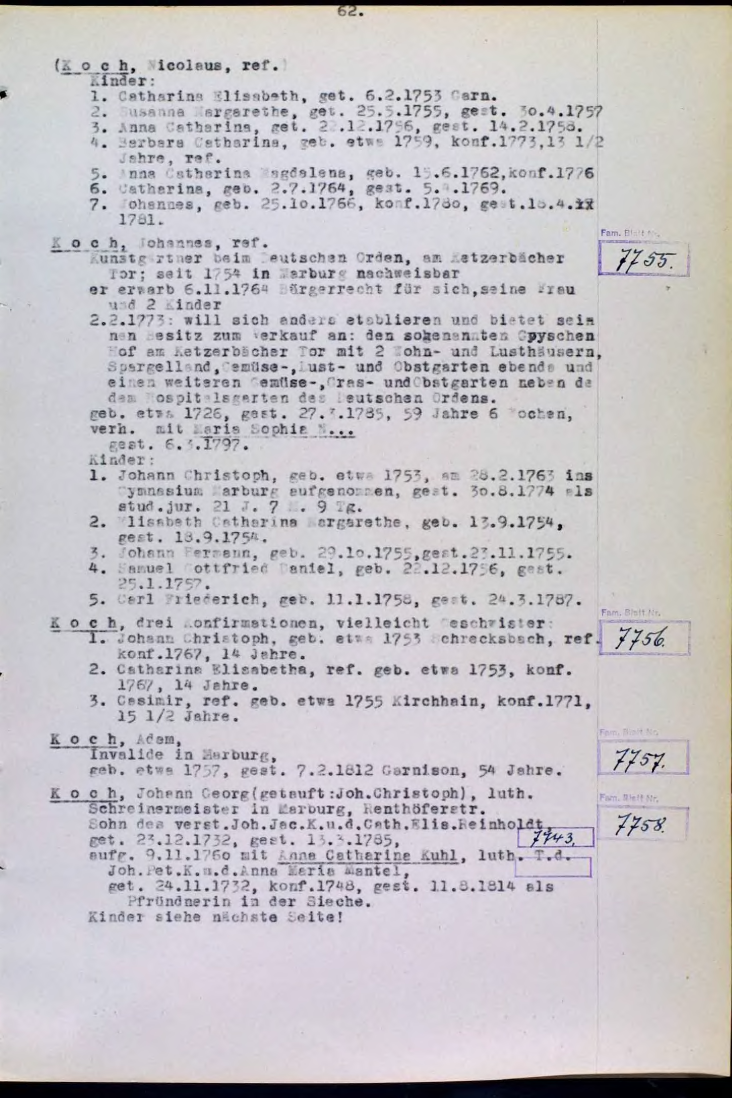 Info non-talk.svg Seit Fertigstellung des Marburger Sippenbuches 1950-1966 sind zahlreiche Ergänzungen und auch notwendige Korrekturen bekannt geworden. Zur aktuellen Seite existiert noch keine Ergänzunges- und Korrekturseite. Wenn Sie selbst Ergänzungen vornehmen möchten, wenden Sie sich bitte an Benutzer:Ernestus.