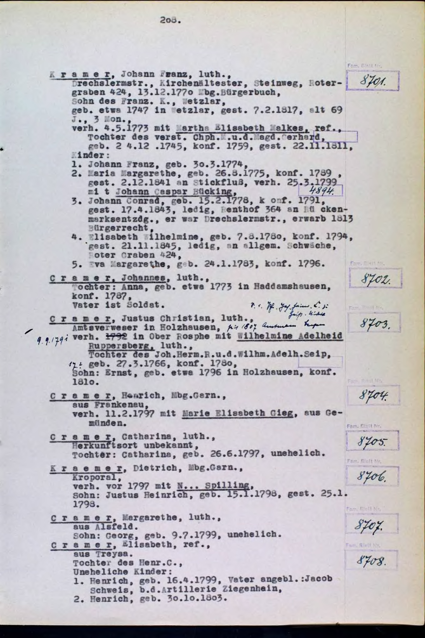 Info non-talk.svg Seit Fertigstellung des Marburger Sippenbuches 1950-1966 sind zahlreiche Ergänzungen und auch notwendige Korrekturen bekannt geworden. Zur aktuellen Seite existiert noch keine Ergänzunges- und Korrekturseite. Wenn Sie selbst Ergänzungen vornehmen möchten, wenden Sie sich bitte an Benutzer:Ernestus.