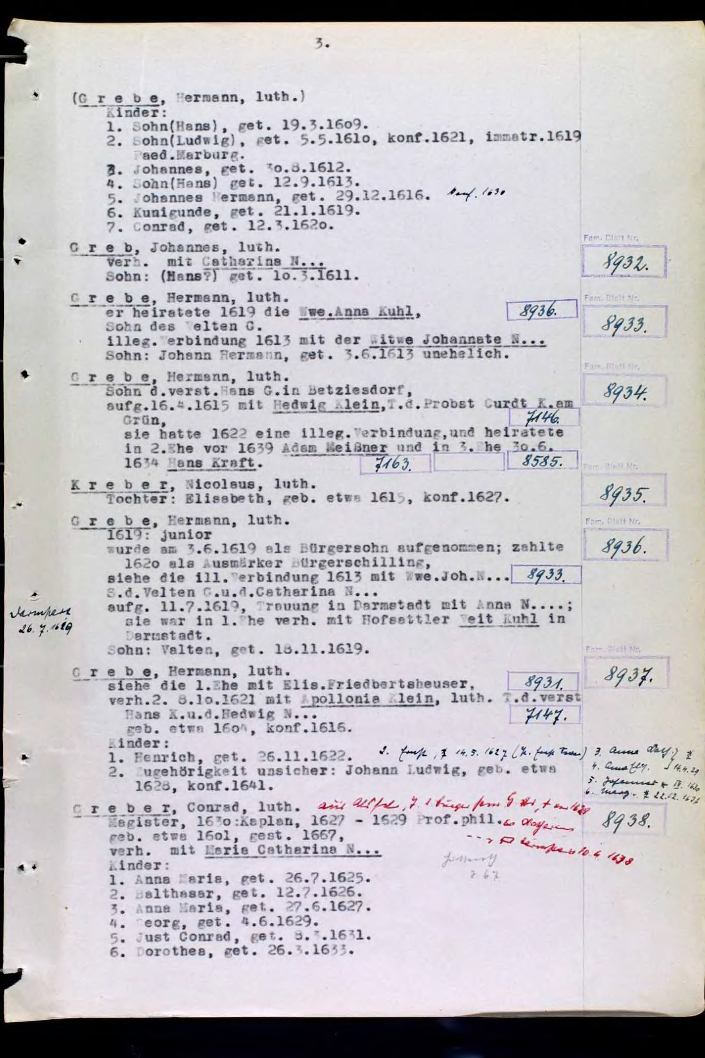 | Seit Fertigstellung des Marburger Sippenbuches 1950-1966 sind zahlreiche Ergänzungen und auch notwendige Korrekturen bekannt geworden. Zur aktuellen Seite existiert noch keine Ergänzunges- und Korrekturseite. Wenn Sie selbst Ergänzungen vornehmen möchten, wenden Sie sich bitte an Benutzer:Ernestus. |